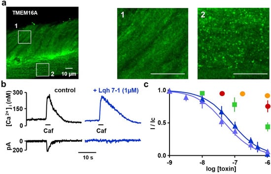 - Caputo, A.; Caci, E.; Ferrera, L.; Pedemonte, N.; Barsanti, C.; Sondo, E.; Pfeffer, U.; Ravazzolo, R.; Zegarra-Moran, O.; Galietta, L.J.V. TMEM16A, a membrane protein associated with calcium-dependent chloride channel activity. Science 2008, 322, 590–594. [Google Scholar] [CrossRef] [PubMed]