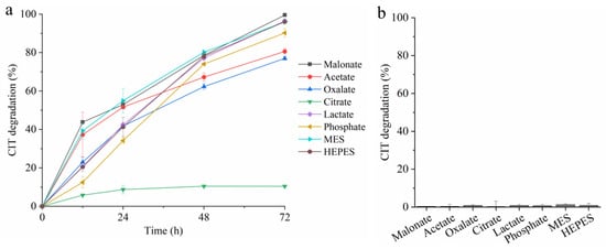Effects of the buffer components on CIT degradation. (a) Degradation of CIT by MrMnP in presence of various buffers. (b) Degradation of CIT when no MrMnP was added. The reactions were carried out by incubating 10 mg/L of CIT and 500 U/L with or without MrMnP in one of the buffers containing malonate, acetate, oxalate, citrate, lactate, phosphate, MES, and HEPES at 30 °C for 72 h. The data shown is the average ± standard deviation.