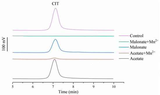 In order to decipher the mechanisms involved in degradation of CIT, the effect of Mn2+ on the degradation rate of CIT in malonate and acetate systems was determined. All the reactions were carried out at 30 °C for 72 h and then the samples were taken out for to analysis in HPLC.