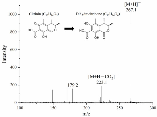 The degradation products of CIT as catalyzed by MrMnP were further analyzed by UHPLC-MS/MS. Although absorbance scanning of the reaction product from 190 nm to 400 nm did not reveal an obvious peak, using the UHPLC-MS/MS analysis, dihydrocitrinone (3,4-dihydro-6,8-dihydroxy-3,4,5-trimethyl-isocoumarin-7-carboxylic acid) was identified to be one degradation product. The parent ion appeared at m/z 267.1 [M+H]−, producing daughter ions of 223.1 [M+H−CO2]− and 179.2, respectively (Figure 4). The continuous loss of carbon dioxide of the parent ion produced sub-ions [27,28]. In a previous study, Margaret et al. used Penicillium viridicatum to degrade CIT and also obtained dihydrocitrinone as one of the degradation products [29]. It is also worth noting that there are studies demonstrating the largely decreased toxicity of dihydrocitrinone in comparison with CIT [30,31,32].