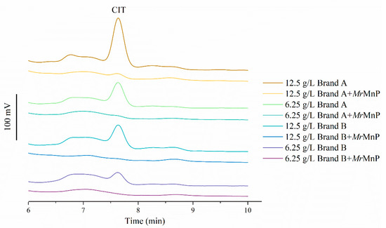 Some enzymes with the ability to degrade mycotoxins may not effectively degrade mycotoxins in food or feed. This is because food or feed contains many ingredients that can either adsorb mycotoxins or act as competitors or even inhibitors of enzymes. For example, many mycotoxins, including zearalenone and aflatoxin B1, are adsorbed on lignocellulose to a certain extent, and lignin phenols are naturally the substrates of MnPs and may interfere with the degradation of mycotoxins [33,34,35,36,37]. CIT has often been found in some traditional Asian food pigments, such as those made from rice fermented by the fungus Monascus. These pigments are commonly used in meat preservation and food coloring [38]. In order to study whether MrMnP can degrade CIT in the real environment with possible interfering ingredients, first CIT was added to different concentrations of Monascus-fermented pigment. The Monascus-generated pigment did not affect the degradation of CIT (Figure S1). Then, the commercially available red yeast rice containing varying concentrations of CIT was used as the substrate. CIT in red yeast rice (4.6 and 2.1 mg/L of citrinin in 12.5 and 6.25 g/L of Brand A, respectively; and 2.4 and 1.2 mg/L of CIT in 12.5 and 6.25 g/L of Brand B, respectively) could all be degraded by MrMnP within 72 h of incubation (Figure 5), as could be observed from the disappearance of the CIT peak (with a retention time of 7.625 min) in HPLC analysis. Therefore, under the tested conditions, MrMnP can be used as a means to remove CIT in the red yeast rice.