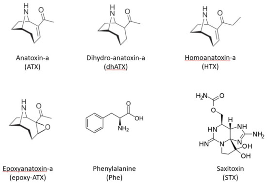 Saxitoxins (STX) are alkaloid neurotoxins, blocking voltage-gated sodium channels, causing nausea, leading to respiratory arrest and death in severe cases (Paralytic shellfish poisoning) [6]. Known STX producing cyanobacteria genera are Aphanizomenon, Dolichospermum (Anabaena), Lyngbya, Cylindrospermopsis and Planktothrix. Anatoxin-a (ATX), 2-acetyl-9-azabicyclo[4.2.1]non-2-ene [7], is a low molecular weight bicyclic secondary amine, neurotoxin that irreversibly binds to nicotinic acetylcholine receptors, causing loss of coordination, muscular fasciculations, convulsions and death by respiratory paralysis [1,8]. Known ATX producing cyanobacteria genera include Dolichospermum (Anabaena), Aphanizomenon, Phormidium and Microcoleus [9,10,11]. In addition to ATX itself, other analogues have been reported such as homoanatoxin-a (HTX), dihydroanatoxin-a (dhATX) and epoxyanatoxin-a (epoxy-ATX) [12,13,14,15,16,17]. (Figure 1).