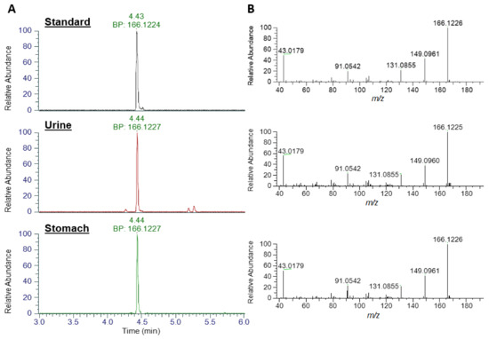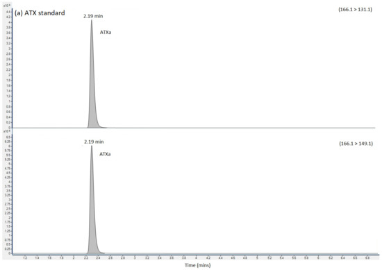 An extracted ion chromatogram (XIC) of ATX standard at m/z 166.1226 (± 5 ppm) exhibited a strong peak at 4.43 min with a base peak of m/z 166.1224, consistent with the singly protonated form of ATX (Figure 3). Analysis of urine and stomach extracts revealed identical peaks at 4.44 min, with base peaks (BP) of m/z 166.1227, evidencing the presence of ATX in these extracts. Product ion scans of standard and extracts revealed identical fragmentation patterns, with dominant daughter ions at m/z 149.0961, 131.0855, 91.0542 and 43.0179, consistent with those daughter ions used in the HILIC-MS/MS method and described elsewhere [15].