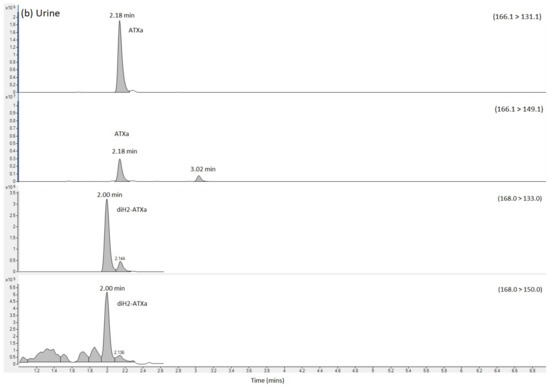 Analysis for dhATX (Figure 4), revealed an earlier eluting chromatographic peak at 4.41 min with an XIC of m/z 168.1383 in both urine and stomach extract, with base peaks identified at m/z 168.1381. No standard was available for comparative analysis. Fragmentation patterns showed matching daughter ions of m/z 43.0179, a shared daughter ion with ATX and also m/z 56.0495. Both of these fragmentation patterns are consistent with those described in [47]. As detailed in Table 2, mass error between the measured and theoretical masses of the parent ion were <2 ppm (0.602 for ATX and −1.189 for dhATX) further confirming their identification.