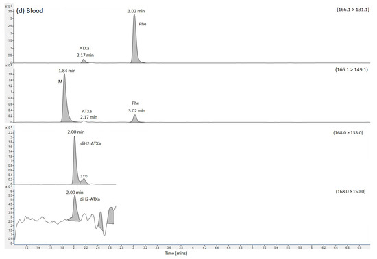 SRM chromatograms obtained following the analysis of (a) ATX calibration standard (b) urine extract (c) Stomach content extract and (d) blood extract, labelling SRM transitions and chromatographic retention times for ATX, dhATX and Phe. ATX = anatoxin-a; dhATX = dihydro anatoxin-a; Phe = phenylalanine; M = matrix interference peak.