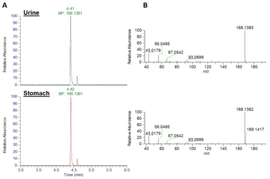LC-HRMS identification of dhATX. (A) Base peak (BP) Extracted Ion Chromatograms at m/z 168.1383 and (B) product ion scans for urine extract (top traces) and stomach extract (bottom traces).
