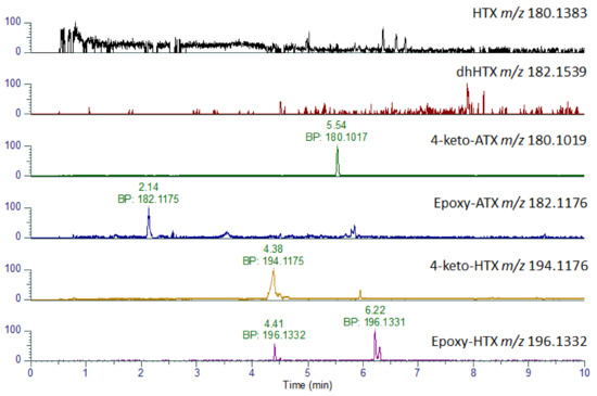 In addition to ATX and dhATX, a number of other analogues were identified including 4-keto-ATX, 4-OH-ATX and epoxy-ATX, as well as their methylated homo analogues [17,47,48,49]. As shown in Table 3, some of these analogues such as HTX and 4-keto-ATX share the same nominal mass and so are difficult to differentiate on LC-MS/MS systems in the absence of authentic standards. However, due to their differing chemical formulae it was possible to distinguish these by LC-HRMS. As the stomach content sample had the highest levels of ATX and dhATX, this sample was used to investigate the presence of these six additional analogues (Table 3). As shown in Figure 5 and Table 3, peaks consistent with the expected parent masses were identified for 4-keto-ATX (5.52 min), 4-keto-HTX (4.47 min), epoxy ATX (2.14 min) and several peaks for epoxy-HTX (4.46, 6.21 min). All these peaks have a mass error of −1.11 ppm or less indicating good confidence in their identification. No peaks were identified for HTX, or diH2-homo ATX (dhHTX). In the absence of analytical standards for these compounds, fragmentation spectrum for these compounds were obtained (Figure S1) in an attempt to confirm their identity. Both 4-keto-ATX (Figure S1A) and 4-keto-HTX (Figure S1C) generated daughter ions consistent with a loss of 59 amu at m/z 121.0647 and 135.0440, respectively. Fragmentation of epoxy ATX (Figure S1B) and epoxy-HTX (Figure S1D) generated ions consistent with the loss of H2O at m/z 164.1072 and 178.1223, respectively as expected from the loss of the epoxide group. Both compounds also produced daughter ions at m/z 56.0495, with epoxy ATX also producing a fragment at m/z 43.0179. These daughter ions are comparable to that reported by [47], although due to the lack of other shared daughter ions, definitive identification of these compounds cannot be assigned.