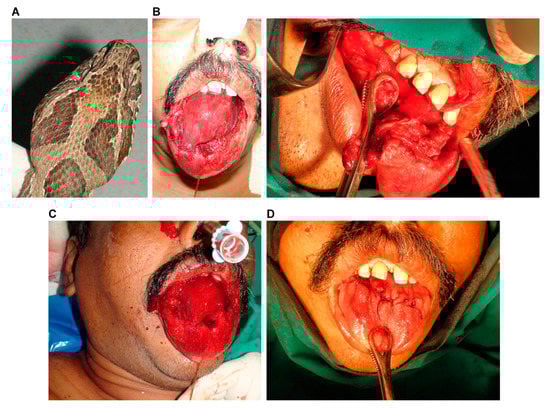 - Medeiros Júnior, R.; Santos Tde, S.; Catunda, I.S.; Queiroz, I.V.; Filho, J.P.; Dourado, E. Snake bite envenomation in tongue. J. Craniofac. Surg. 2012, 23, e652–e654. [Google Scholar] [CrossRef] [PubMed]