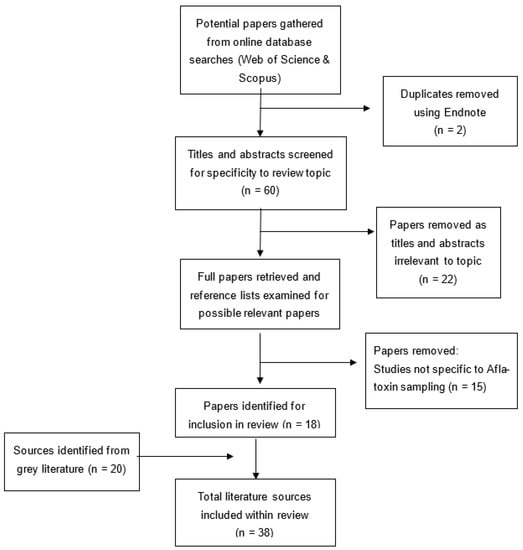 The Campbell Methods Guide was followed for this review [53]. Gray literature sources and a range of peer review literature searches were examined to address the main guidelines and factors considered within AF sampling procedures for corn. Non-peer reviewed sources from the gray literature were obtained via Google search engine, to identify relevant governmental, non-governmental sources, and business publications, reports, guidelines, and standards on mycotoxin sampling procedures. Specific gray literature sources included: