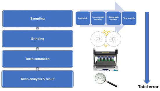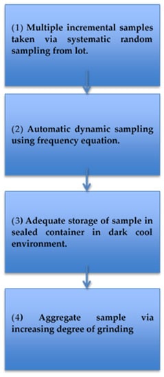 National and international organizations have established sampling procedures for a variety of grain commodities [4,15,18,20,23,30,31,34]. Each sampling procedure contains different specifications associated with sampling; however, some procedures are more comprehensive than others. The AF-testing procedure consists of three stages: sampling, sample preparation, and analysis (Figure 2).