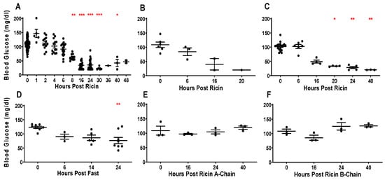 Hypoglycemic response to parenteral injection of ricin. Blood glucose of mice at different time points, each dot represents an individual mouse. Blood glucose is shown on the vertical axis and time post injection is on the horizontal axis. Swiss mice were used, except where noted. The mean and standard error for each time point are shown. The Kruskal–Wallis test was performed and the red asterisks above the groups show the results of Dunn’s multiple comparison test vs. the control group: 0.05 (*), 0.002 (**), and <0.001 (***). (A) Ip injection of 30 µg/kg of ricin into mice. The mice shown here were used in the experiments described in the remaining figures. (B) Iv injection of the same dose of ricin. (C) Ip injection of ricin into NSG mice. (D) No ricin injection or food given. (E) Ip injection of 60 µg/kg ricin A-chain. (F) Ip injection of 60 µg/kg ricin B-chain.
