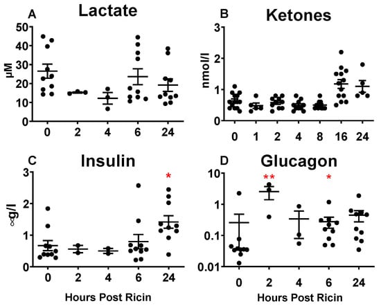 Systemic metabolic and hormonal response in plasma to ricin injection. Metabolite or hormone levels were measured in plasma at different time points. Each dot represents an individual mouse. The Kruskal–Wallis test was performed and the red asterisks above the groups show the results of Dunn’s multiple comparison test vs. the control group: 0.05 (*) and 0.002 (**). (A) Lactate. (B) Ketones. (C) Insulin. (D) Glucagon.