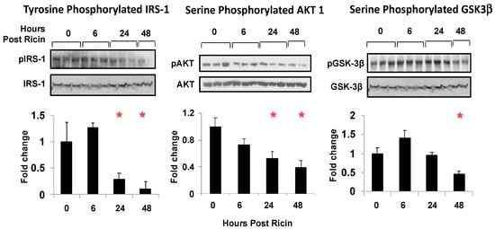 A glucose tolerance test was administered to the mice at 4 h, 16 h, or 24 h post ricin administration (Figure 5). To account for the differences in initial blood glucose levels resulting from ricin administration, blood glucose was normalized to a baseline value from the measurement taken immediately prior to glucose injection. The mice that were exposed to ricin for 4 h or 16 h were able to clear the glucose load as well as the mice that were not exposed, with the values returning to or near their baseline values at 120 m. However, at 24 h post ricin administration, glucose clearance was impaired (Figure 5A). The area under the curve (AUC) was calculated to compare the groups. The AUC of the mice exposed to ricin for 24 h was larger, but not significantly so (Figure 5B). This observation paired with the observed increase in insulin levels (Figure 4C) suggested insulin resistance 24 h post ricin. To investigate the mechanism of insulin resistance in ricin-mediated hypoglycemia, we performed immunoblotting to determine whether insulin signaling in the liver was affected following ricin exposure (Figure 6). The relative abundance of the phosphorylated to unphosphorylated forms of proteins involved in the signaling pathway were measured to determine the effects of ricin on the kinase phosphorylation cascade initiated by insulin binding to its receptor. There was a time dependent decrease in the phosphorylation of insulin receptor substrate 1 (IRS-1), RAC-alpha serine/threonine-protein kinase/protein kinase B (AKT-1), and glycogen synthase kinase-3 (GSK3- b), with the decrease becoming significant at 24 h and 48 h post ricin. This indicates that insulin signaling was downregulated, thus providing an explanation for the insulin resistance.