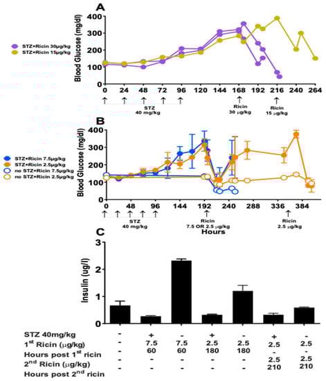 To further clarify insulin’s role in post ricin hypoglycemia, the mice were injected with STZ, a chemotherapeutic agent that is specifically cytotoxic to pancreatic β cells and results in a lack of insulin and chemically induced diabetes [44,45]. Blood glucose increased following STZ injection in all mice. After injection of ricin at 30 µg/kg and 15 µg/kg (Figure 7A), the blood glucose level rapidly dropped to a lethal concentration and mice were sacrificed. After injection of ricin 7.5 µg/kg and 2.5 µg/kg (Figure 7B), blood glucose dropped whether or not the mice received STZ. Following the initial drop, blood glucose rose in mice that received STZ. All of the mice that received ricin 7.5 µg/kg developed signs of ricin toxicity and were euthanized, whether or not they were hypoglycemic or were treated with STZ. Ricin (2.5 µg/kg) was injected a second time into the mice that initially received 2.5 µg/kg of ricin. The second ricin injection proved to be lethal, and the mice were sacrificed (Figure 7B). The plasma insulin levels of the mice in Figure 7B were measured to confirm that the STZ effectively suppressed insulin production, which it did. The insulin concentration was much higher in groups that did not receive STZ in comparison to mice that did (Figure 7C). Thus, the observed drop in blood glucose was independent of insulin production. The insulin resistance that developed in concordance with developing hypoglycemia may represent a defense mechanism, preventing any further lowering of the blood sugar by insulin.