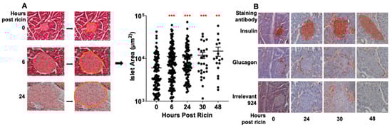 Islets of Langerhans’ increase in size following ricin injection. The mice were injected ip with 30 µg/kg of ricin, and they were sacrificed at the indicated time points. The tissue was fixed and histological examination was performed. (A) Individual islets were morphologically identified, a region of interest was drawn around the circumference, and the areas were calculated. Only a single section was analyzed per mouse. Each dot represents the area of an identified islet. Mean and SEM are indicated. The Kruskal–Wallis test was performed and the red asterisks above the groups show the results of Dunn’s multiple comparison test vs. the control group: 0.002 (**) and <0.001 (***). (B) Immunohistological staining of pancreatic islets. Tissue sections were incubated with Ab to insulin, glucagon, and an irrelevant isotype control followed by alkaline phosphatase conjugated secondary Ab and the substrate aminoethyl carbazole.