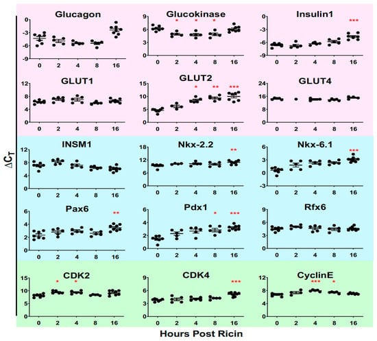 Real-time PCR quantification of gene expression in isolated islet cells. The mice were injected with ricin 30 µg/kg and 5 mice were sacrificed at each of the indicated timepoints. Each dot represents an individual mouse. Pancreatic islets were isolated and RNA was extracted. qRT PCR was performed, two replicates were run for each mouse and the mean cycle threshold was determined. ΔCt was calculated by subtracting the cycle threshold of the baseline gene, GADPH, from the cycle threshold of the specified gene. Pink indicates genes involved in glucose regulation, blue endocrine differentiation and green cell cycle regulation. CDK: cyclin-dependent kinase, INSM1: insulinoma-associated antigen-1, GLUT: glucose transporter. The Kruskal–Wallis test was performed and the red asterisks above the groups show the results of Dunn’s multiple comparison test vs. the control group: 0.05 (*), 0.002 (**), and <0.001 (***).