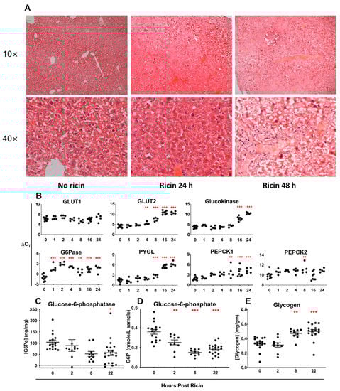 Histochemical, gene expression, and biochemical profiles in the liver post ricin injection. The mice were injected with 30 µg/kg of ricin and sacrificed at indicated timepoints. The livers were removed and either immediately frozen or fixed in formalin. (A) Fixed tissues were stained with H&E and are shown at 10 and 40 magnification. (B) QRT PCR was performed on RNA extracted from the liver. ΔCt was calculated as described previously. GLUT: glucose transporter, G6Pase: glucose-6-phosphatase, PYGL: glycogen phosphorylase for liver, PEPCK: phosphoenolpyruvate carboxykinase. (C) ELISA was used to quantify the amount of the catalytic component of G6Pase present in BALB/c mice. (D) Glucose-6-phosphate was quantified in BALB/c mice using an enzyme assay. (E) Coupled en zyme assay was used to quantify glycogen in BALB/c mice. In panels (B–E), the Kruskal–Wallis test was performed and the red asterisks above the groups show the results of Dunn’s multiple comparison test vs. the control group: 0.05 (*), 0.002 (**), and <0.001 (***).