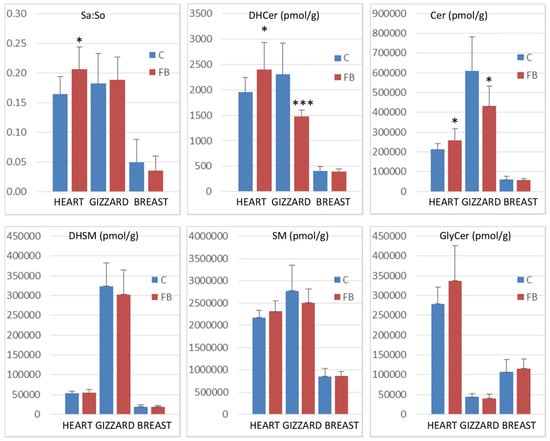 Figure 2. Sphinganine:sphingosine (Sa:So) ratios and concentrations of sphingolipid reported as the total of dihydroceramides (DHCer), ceramides (Cer), dihydrosphingomyelins (DHSM), sphingomyelins (SM), and glycosylceramides (GlyCer) in the heart, gizzard, and breast muscle of chickens fed the control diet free of mycotoxins (C) and chickens fed 9 days with a diet containing 20.8 mg FB1 + FB2/kg (FB). * 0.05< p <0.01 and *** p < 0.001.