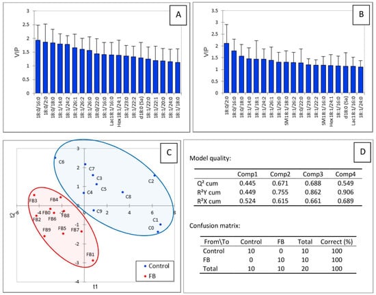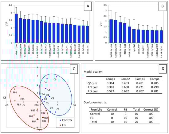 Figure 5. PLS-DA of sphingolipids measured in the gizzards of chickens fed for 9 days with a control diet free of mycotoxins or a diet containing 20.8 mg FB1 + FB2/kg. (A) Scores of the VIP for the first component and (B) the second component. (C) Discrimination on the factor axes extracted from the original explanatory variables. (D) Quality of the model and confusion matrix for the training sample (variable groups).