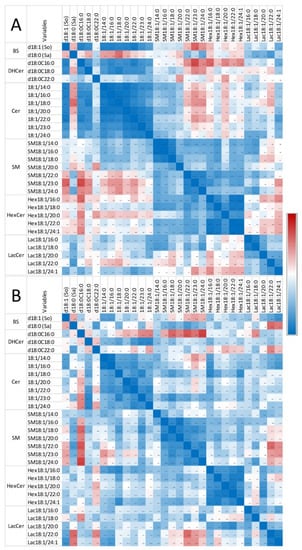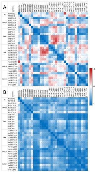 Only weak correlations were observed between Sa and So, among the sphingoid bases and the other sphingolipids in control chickens (i.e., unexposed to fumonisins) (Figure 4A). Moreover, the correlations among the different classes of sphingolipids were weak, except for ceramides and glycosylceramides, which exhibited significant positive correlations, and ceramides and sphingomyelins, which exhibited significant negative correlations. By contrast, significant positive correlations were observed within the same class among dihydroceramides, ceramides, sphingomyelins, hexosylceramides, and lactosylceramides, which have similar fatty acid chain lengths. The feeding of fumonisins strongly increased the positive correlations measured among sphingolipids in the heart (Figure 4B). Notably, significant positive correlations among the different classes of sphingolipids were observed in chickens fed fumonisins, which was not the case in the controls. Moreover, the coefficients of correlation found among the same class of sphingolipids with similar fatty acid chain lengths were generally increased (Table S1B). The correlations among unsaturated sphingolipids and other analytes were close to those observed for the corresponding saturated forms. The correlations among C25 and C26 sphingolipids and other analytes were close to those observed for C24 sphingolipids (Table S1).