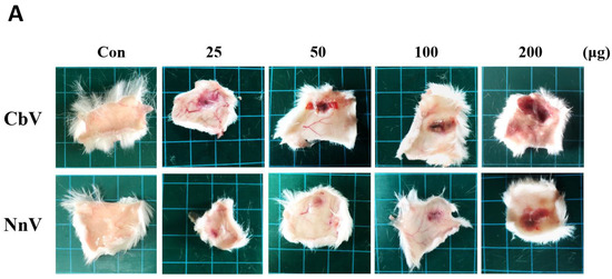 The jellyfish venoms were not only edematogenic but also caused hemorrhage and a subsequent progression to skin necrosis. The onset of a jellyfish venom-induced hemorrhage appears to be due to the degradation of the extracellular matrix (ECM) and basement membrane proteins surrounding the blood vessels by toxic proteases. To investigate the hemorrhagic activity of CbV and NnV, the venoms were intradermally injected into mice’s dorsal skin with various concentrations (Figure 5A). Macroscopic analysis of the inner surface of injected skins showed hemorrhagic changes (Figure 5B). After 3 h of intradermal injection, the mice were euthanized, and the skins were removed for examination. The minimal hemorrhagic dose (MHD) was applied to estimate the hemorrhagic potency. The MHD of the venoms were found to be 55.6 and 83.4 μg/mouse for CbV and NnV, respectively. CbV showed more severe hemorrhagic changes in the subcutaneous tissue, whereas less severe hemorrhagic changes were identified from NnV, and no significant alteration was detected in the control mice’s skin.