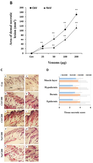 Skin necrotic activity was evaluated using the method of ref. [61] with a minor modification. Briefly, randomized groups (n = 5 per group) of BALB/c mice were intradermally administered 100 μL of PBS having various doses of the venoms (0–200 μg/kg) into the shaved dorsal skin. Control groups were injected with 100 μL of PBS alone. After 72 h, the mice were euthanized and the dorsal skins of the injection sites were removed, and the necrotic lesion diameters were assessed on the inner side of the skins. The areas of the skin necrotic lesions were measured using the formula, Area (A) = Length (L) × Width (W), and NIH Image software (Image J). The minimum necrotic dose (MND) for the present study was defined as the least amount of venom (µg dry weight) which when injected intradermally into mice, induced necrosis of 1 cm2 at 3 days following injection. The skin tissues were processed for examining 8+ further histopathological alterations, then the tissue dermal necrosis was scored according to Ho et al. [62] (Table 2).