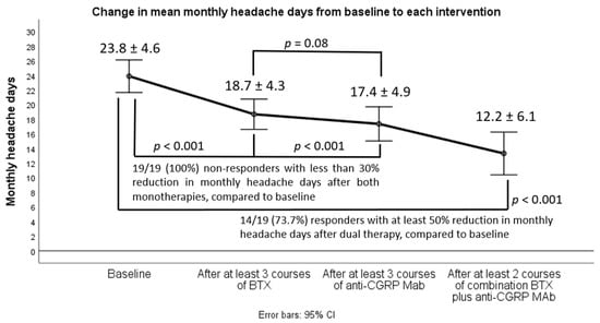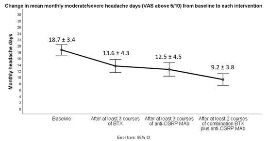 Patients’ headache diaries were retrieved from their medical files, kept in the corresponding headache outpatient clinics, and used in order to serve our primary objective, which was to document potential differences in clinical headache outcomes after each monotherapy or dual treatment compared to baseline or between interventions. Headache efficacy variables during the whole exploratory treatment period included (i) the crude efficacy of monotherapies or dual therapy as expressed by the change in mean number of MHD compared to baseline and comparatively (BTX alone vs. anti-CGRP alone) between monotherapies, (ii) change in mean MHD with peak moderate/severe intensity (more than 4 out of 10 on a 0–10 numerical scale) of cephalalgic pain from baseline to each (and between) single or dual therapy, and (iii) change in days with intake of any acute headache medications, either triptans, nonsteroidal anti-inflammatory drugs, or other, from baseline to each intervention. We generally considered patients with at least 50% reduction in MHD after each intervention compared to baseline as responders, while the number of responders between monotherapies and dual targeting was compared to document the corresponding degree of efficacy in this sample of quite difficult-to-treat CM patients.