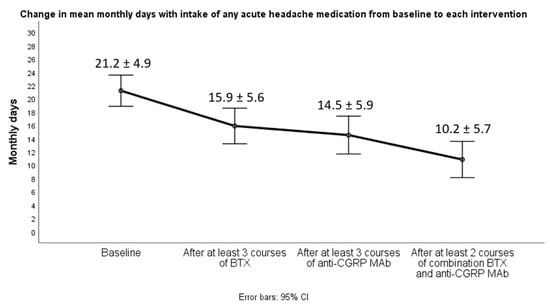 Changes in mean monthly days with intake of any acute migraine medication between baseline, monotherapy interventions and combined treatment.