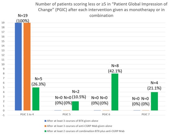 The significant improvement, which was evident in efficacy headache outcomes solely after dual targeting, had an obvious impact on disability scale scores and was strongly associated with a significant reduction in MIDAS (138.4 ± 69.5 vs. 9.3 ± 4.8; p < 0.001) and HIT-6 (72.9 ± 4.6 vs. 60.6 ± 8.5; p < 0.001) scoring. The efficacy to dual therapy obviously influenced the perception of change and satisfaction of responders, as all of them (15/19) remained satisfied (score ≥ 5) on the Patient Global Impression of Change (PGIC) scale. Specifically, 2 scored 5, 8 scored 6, and 4 scored 7 (Figure 4).