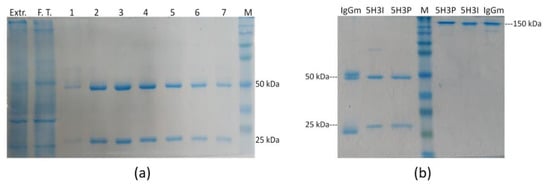 The recombinant mAb was purified by protein G affinity chromatography from leaves of vacuum-agroinfiltrated plants harvested 6 days post-infiltration (Figure 2a). The quality of recombinant purified mAb 5H3 was evaluated by reducing and not reducing SDS–PAGE (Figure 2b), confirming an efficient purification yield and high purity degree (>95%). SDS-PAGE under reducing conditions of eluted fractions showed the expected bands migrating at 50 and 25 kDa corresponding to HC and LC, respectively. No additional bands were detected, indicating the integrity of the purified antibody.