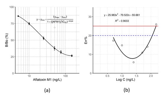 The LOD, LLOQ, and ULOQ were calculated from the error curve (Figure 3b), as the level of AFM1 that can be estimated with intra- and inter-assay error below 25 and 20%, respectively, and resulted to be 3 ng/L, 5 ng/L, and 110 ng/L, respectively. In summary, the assay achieved high sensitivity and accuracy.