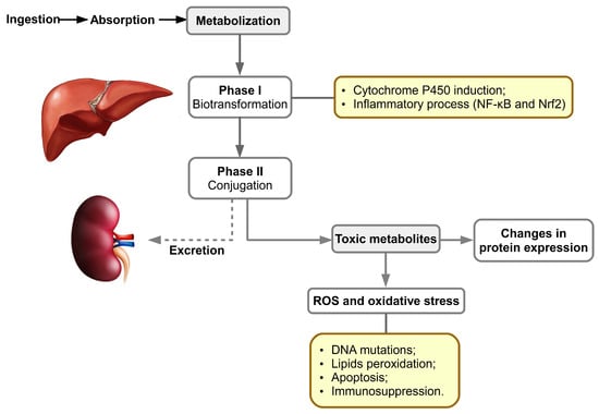 After ingestion of contaminated food, aflatoxins are absorbed in the intestine; following their distribution, metabolism and excretion, the liver is the first and main organ affected (Figure 3). They also accumulate in muscle. P450 cytochromes play an important role in phase I biotransformation of xenobiotics, especially those belonging to families 1 and 3 [56]. In mammals, the enzymes with the highest levels of protein expression, and involved in the conversion of aflatoxins, are CYP1A2 and CYP3A4. The metabolite resulting from the oxidation reaction can bind to DNA, causing genotoxicity, and proteins generating cytotoxicity. For example, AFB1 binds to guanine residues of nucleic acids, resulting in AFB1 adducts that can lead to transversion of guanine–cytosine (GC) to thymine–adenine (TA) and implicitly to irreversible DNA damage. Binding of AFB1 to proteins is irreversible, the most well-known adduct being ADB1-lysine in albumin. In the first stage of metabolic oxidation in the liver, an epoxy reactive intermediate (e.g., AFB1-8,9-epoxide) is formed or this is hydrolyzed to a less toxic form, AFM1 [57,58].