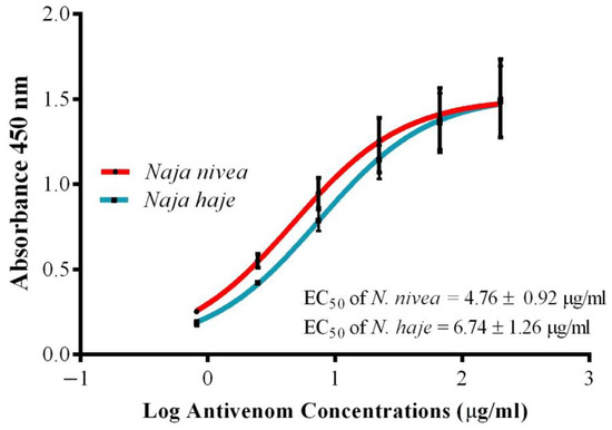 The immunoreactivity of VAPAV toward the venom antigens of N. nivea and N. haje were studied with an indirect enzyme-linked immunosorbent assay (indirect ELISA) as previously described [66]. The wells of the 96-well immunoplate were pre-coated with 10 ng of venom antigen at 4 °C overnight. The immunoplate was flicked dry and rinsed with phosphate-buffered saline with 0.5% Tween® 20 (PBST) 4 times to remove the excess antigens. The antivenom was appropriately diluted at 1:100, 1:300, 1:900, 1:2700, 1:8100, and 1:24,300 from a stock concentration of 20 mg/mL. A total of 100 µL of diluted antivenom was then added to each of the antigen-coated wells for incubation at room temperature for 1 h. The incubates were then removed by flicking the immunoplates and washing them with PBST. 100 µL of horseradish peroxidase-conjugated antihorse-IgG (Jackson ImmunoResearch Inc., West Grove, PA, USA) pre-diluted in PBST (1:10,000) was then added into each well, and the incubation took place for 1 h at room temperature. The excess unbound conjugated antibodies were then removed by flicking the immunoplates and washing them 4 times with PBST. Fifty microliters of freshly prepared 3,3′5,5′-tetramethylbenzidine (TMB) substrate solution was subsequently added, and the enzymatic reaction took place in the dark for 10 min at room temperature. The reaction was terminated by adding 50 µL of 12.5% sulfuric acid, and the absorbance was measured at 450 nm using a Tecan i-control™ infinite M1000Pro microplate reader (Tecan, Männedorf, Switzerland). All values were means ± S.E.M. of triplicate experiments. The immunoreactivity was expressed as the half-maximal effective concentrations (EC50), interpreted as the antivenom concentration that results in 50% of the venom-antivenom binding reaction.
