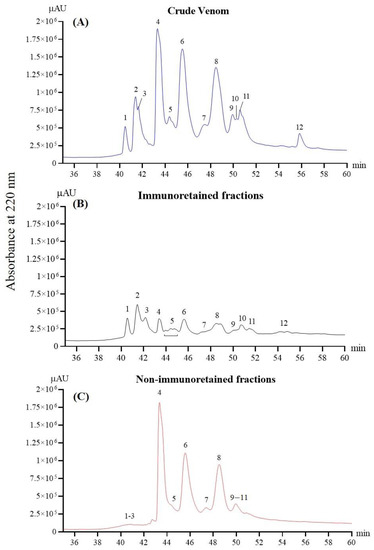 The RP-HPLC profiles of the whole venom, immunoretained and non-immunoretained venom proteins, are shown in Figure 4 (panels A, B, and C, respectively). The result illustrates the antivenomics for VAPAV against N. nivea venom, where the antivenom was shown to immunorecognize and bind to the 12 protein fractions of venom at different degrees of immunoreactivity. Comparing between the profiles (Figure 4A–C), proteins in RP-HPLC fractions 1, 2, and 3, as well as the tailing fraction 12, were most markedly immunocaptured by VAPAV, whereas proteins in fractions 4–8 were least immunoretained. The degrees of immunoretention of venom proteins in these fractions were tabulated as percentages in Table 3. Accordingly, the VAPAV affinity column efficiently immunorecognized venom proteins in fractions 1, 2, and 3 (68–70% immunoretention). The binding activity of VAPAV for venom proteins in fraction 12 was moderate (~58% immunoretention) but low for those in fractions 4–11 (~20–25% immunoretention). The result of immunoretention was consistent with the corresponding non-immunoretained fractions, as shown in Figure 4C, where unbound proteins were washed out from the affinity column.