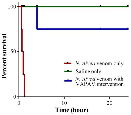 The experiment mimics the natural setting of snakebite and antivenom treatment. It was conducted in an envenoming and rescue model in mice as previously described [22,70]. The subcutaneous LD50 of N. nivea venom was first established by injecting the venom at various doses into the loose skin over the neck of the mice (20–25 g, n = 4 per dose). The number of deaths of the mice at each dose was recorded at 24 h. In the envenoming and rescue model, a challenge dose of venom (5 × s.c. LD50) dissolved in 50 µL saline was inoculated subcutaneously into the mice (20–25 g, n = 8). The mice were monitored closely for the development of neurological signs. In the rescue group, the antivenom (VAPAV) was administered as a bolus of 250 µL intravenously (via the caudal vein) upon the onset of neurotoxicity indicated by posterior limb paralysis. Mice in the control (untreated) group (20–25 g, n = 8) received 250 µL of saline instead upon the onset of neurotoxicity. The progress of neurotoxicity (deterioration or reversal) in the mice was closely monitored over 24 h. All mice were allowed free access to food and water ad libitum throughout the experiment.