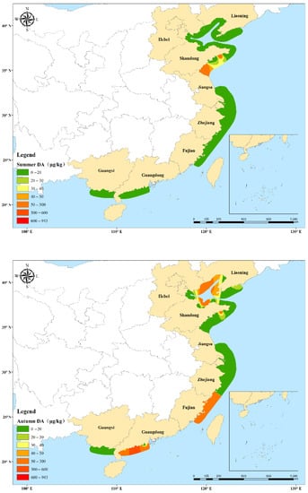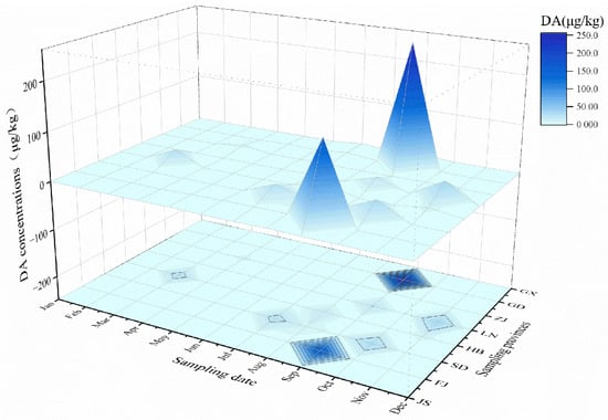 2.3. Spatial and Temporal Variations in DA Concentrations in Shellfish Samples
