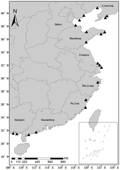 - Fishery Bureau of the Ministry of Agriculture and Rural Affairs of China. Chinese Fishery Statistical Yearbook; China Agriculture Press: Beijing, China, 2022. [Google Scholar]