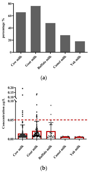 The percentage and distribution of positive samples of AFM1 in raw cow, goat, buffalo, camel, and yak milk in China in 2016 are displayed in Figure 1. Contamination of AFM1 was positive in 65.7% of cow milk, 76.0% of goat milk, 48.0% of buffalo milk, 28.0% of camel milk, and 18.0% of yak milk. With respect to these positive samples, only 6 cow milk, 9 goat milk, and 2 buffalo milk samples do not meet the EU standard. The highest value of AFM1 levels is 0.191 µg/L in a cow milk sample, which is far below the American and Chinese limit standard. The review of recent published data on the AFM1 occurrence levels indicates that the global incidence of AFM1 in milk has remained one of the most critical and noteworthy food safety issues in developing regions of the world [19]. In China, the comprehensive application of quality and safety management in the dairy industry has effectively guaranteed the safety of raw milk and milk products [12]. Meanwhile, regular and uninterrupted surveillance of AFM1 in milk is necessary for continuously improving the safety of products [2].