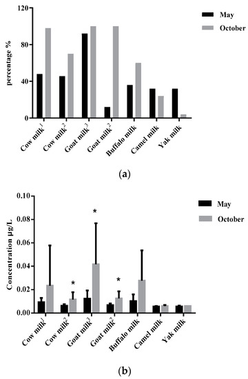 Comparisons of positive samples of aflatoxin M1 collected between May and October in raw milk from five dairy species in China showed by percentage (a) and mean (b). Positive samples indicate an aflatoxin M1 concentration exceeding the quantification limit of 0.005 µg/L; percentage = (positive sample no)/(sample no) × 100%; the symbol of * represents significant differences (p < 0.05) in aflatoxin M1 levels between May and October in each group; 1: samples collected from Sichuan; 2: samples collected from Shandong; 3: samples collected from Shanxi.