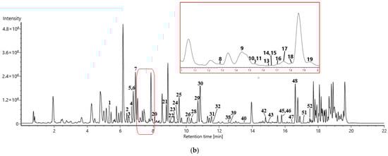 | No | Assigned Identity | tR (min) | Molecular Formula | Theoretical Exact Mass (Da) [M + H]+ | Mean Measured Mass (Da) [M + H]+ | Mass Accuracy (ppm) | MS/MS Fragments a (+H, +NH4, +Na) | Relative Content c | |