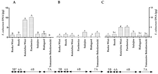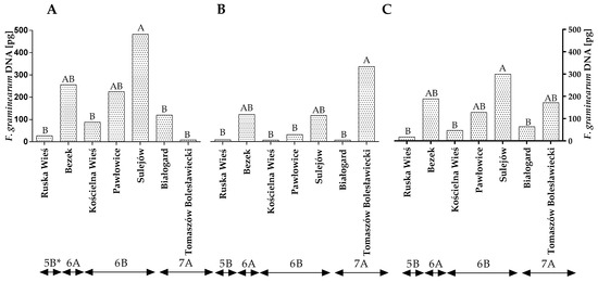 Quantity of F. culmorum DNA (pg) in winter wheat grains grown in different locations in Poland (* climatic regions) (A) during 2015, (B) during 2016 and (C) the average over the years of the study. a, b and c—significant at p ≤ 0.05; A, B and C—significant at p ≤ 0.01.
