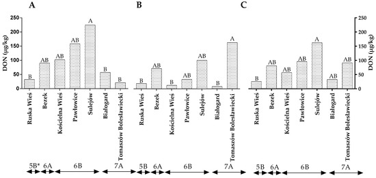 Quantity of DON in winter wheat grains grown in different locations in Poland (* climatic regions) (A) during 2015, (B) during 2016 and (C) the average over the years of the study. a, b and c—significant at p ≤ 0.05; A, B and C—significant at p ≤ 0.01.