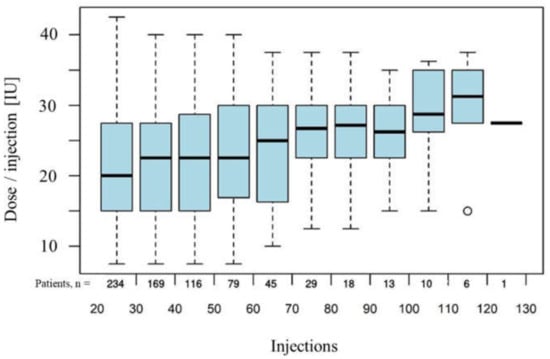 Doses of onabotulinumtoxin A administered over the long term, with time represented by consecutive number of injections. The box of a box-plot represents the quartiles (25%- and 75% percentile) of the empirical distribution. The wiskers show values up to the 1.5 fold of the inquartile range above and below the box. Values outside this range are represented by circles.