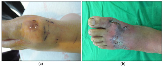 The typical wound progression of severe cobra envenomation on the foot of a 68-year-old female. (a) Nine hours after the snake bite. Fang marks (white arrow) were found on the lateral aspect of the first metatarsal joint of the left foot, and the injuries extended forward to the toes and backward to the instep with swelling and erythematous changes. The demarcated bruising skin indicated the possible range of subcutaneous necrotic change. No bullae formation was noted at this time; (b) Five days later. Increased erythematous swelling extended over the ankle joint, and worsened dermonecrosis was noted across the instep.