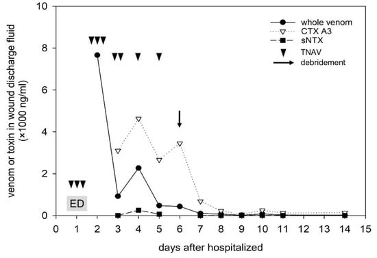 The evolution of the whole venom, CTX A3, and sNTX concentrations in the local wound discharge collected from the 68-year-old female. The data on Day 2 is the venom concentration of the vesicle fluid of bulla that developed about one day after being bitten. Venom concentration decreased significantly after the specific antivenom was administered. A relatively high concentration of CTX A3 was detected from the local wound discharge and persisted until advanced debridement on Day 6. ED: emergency department; TNAV: bivalent antivenom for B. multicinctus and Naja atra, produced by Taiwan Centers for Disease Control.