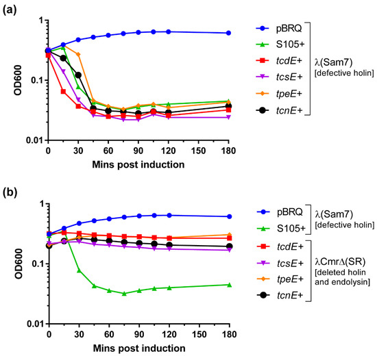 We evaluated the holin-like activity of TcsE, TpeE, and TcnE by complementing an E. coli λ lysogen defective for the S105 holin with their respective encoding genes, as previously performed for TcdE and UviB [10,37]. The tcsE, tpeE, and tcnE genes were cloned into the heat-inducible expression plasmid pBRQ(ΔRBS) and were introduced into E. coli MC1061 carrying the λ lysogen (cI857Sam7), which has a functional endolysin gene but a nonsense mutation in its holin gene. When the λ holin S105 gene is used to complement the holin gene mutation in this strain, bacterial lysis is completed 45 min after heat induction (Figure 3a) since the presence of a functional holin allows the endolysin to cross the membrane and degrade murein from the outside, resulting in cell lysis. No lysis was observed in the presence of the vector alone (Figure 3a). When TcsE, TpeE, and TcnE were expressed in E. coli strain MC1061(λcI857Sam7), complete bacterial lysis was seen ~45 min after heat induction, similar to the positive control (λ holin S105) and to TcdE (Figure 3a). Expression of TcsE, TpeE, and TcnE in the E. coli strain λCmrΔ(SR), which has deletions in both the holin and endolysin genes, did not cause cell lysis (Figure 3b), confirming that lysis in the strain MC1061(λcI857Sam7) resulted specifically from holin-facilitated endolysin activity, demonstrating that these proteins function in the same way as a phage holin, similar to TcdE [10]. This finding also supports the role of TpeE as a holin protein [22], which, until now, had not been shown to complement holin functionality.