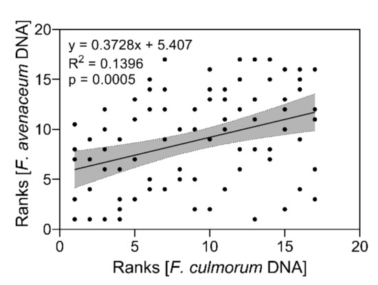 Relation between calculated resistance ranks according to F. culmorum and F. avenaceum DNA content in mature barley heads after bruised grain inoculation in field trials between 2016 and 2020. Data analysis: Simple linear regression; p value indicates significance of the slope from zero. Grey shaded areas represent 95% confidence bands of the best-fit line.