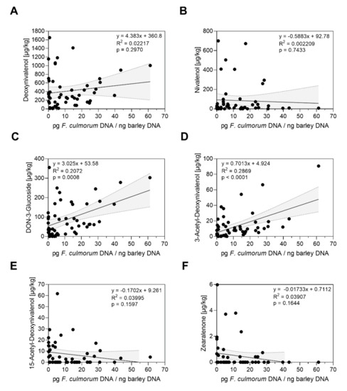 Relations between F. culmorum DNA and Fusarium toxin contents in mature barley heads after bruised grain inoculation in the field between 2018 and 2020. The figures show contents of F. culmorum DNA each correlated with (A) contents of deoxynivalenol, (B) contents of nivalenol, (C) contents of deoxynivalenol-3-glucoside, (D) contents of 3-acetyl-deoxynivalenol, (E) contents of 15-aceytl-deoxynivalenol and (F) contents of zearalenone in µg/kg. Data analysis: Simple linear regression; p value indicates significance of the slope from zero. Grey shaded areas represent 95% confidence bands of the best-fit line.