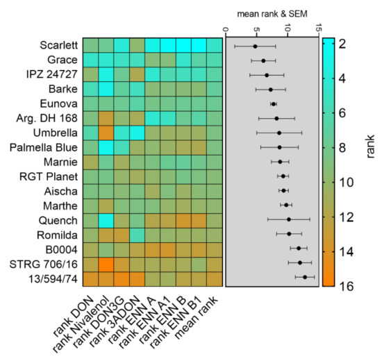 Mean contents of the most predominant Fusarium toxins produced by F. culmorum or F. avenaceum were used to calculate severity ranks for mycotoxin contamination in the same manner as for fungal DNA contents (Figure 6). The data reveal a low mean rank for Scarlett (mean rank 4.75), indicating little contamination with Fusarium toxins over three years. In contrast, genotype 13/594/74 had high ranks for DON, NIV, DON3G, 3ADON and enniatins resulting in the highest mean rank (12.75) equal to strong contaminations with mycotoxins and indicating low resistance towards mycotoxin production after Fusarium infection (Figure 6).
