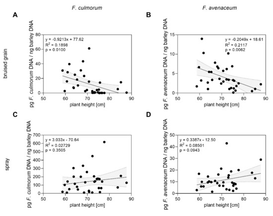 Relations between mean plant height and mean F. culmorum or mean F. avenaceum DNA in mature barley heads in field trials between 2019 and 2020. Data points represent data of 17 genotypes in bruised-grain-inoculated (A,B) and in spray-inoculated (C,D) plots, respectively, and mean plant height of each genotype recorded in 2019 and 2020. Data analysis: Simple linear regression; p value indicates significance of the slope from zero. Grey shaded areas represent 95% confidence bands of the best-fit line.
